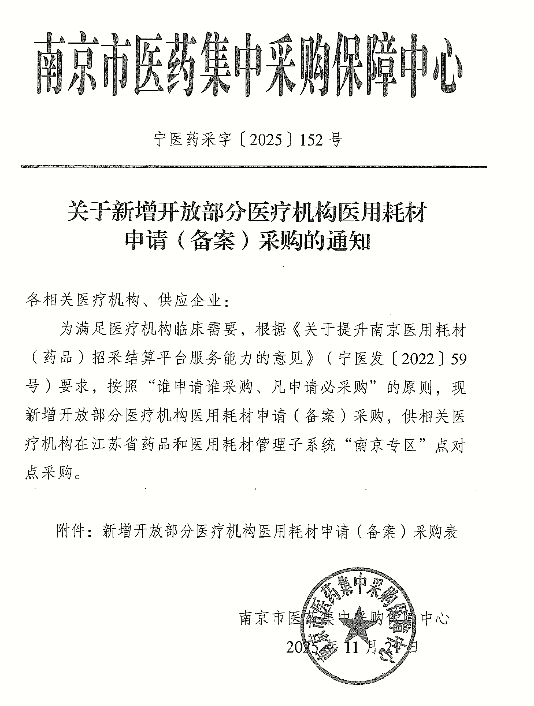 寧醫藥采字〔2025〕152號—江蘇省南京市關于新增開放部分醫療機構醫用耗材申請(備案)采購的通知
